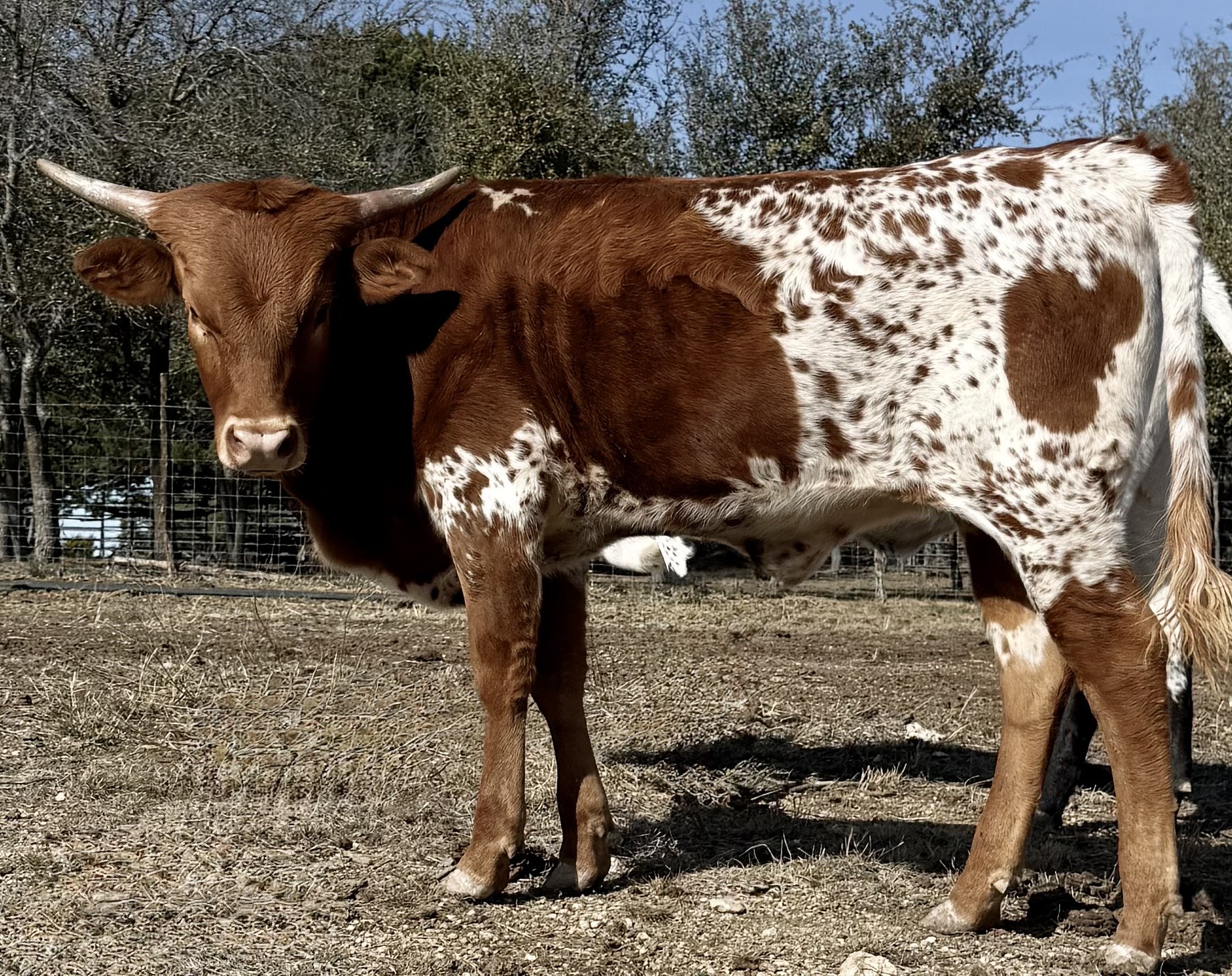 The first words that come to mind upon meeting our Lass are: sturdy, interesting, colorful and correct. A deep wine base with black accents splash throughout her coat. Her dam is a tri color beauty from the famed Sassie line, known for its graceful, long twisty horn. And her sire, M7 Irish Luck, needs no introduction. A multiple futurity winning true black, Irish is everything any breeder would look for. He throws color and has horn for days. Irish Lass clearly has her mother's beauty and her father's frame. She is a joy to behold.